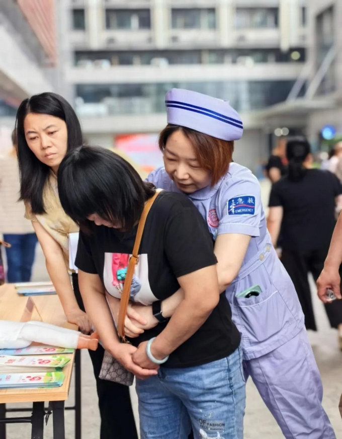 護(hù)理人員現(xiàn)場(chǎng)向市民演示、講解海姆立克急救法