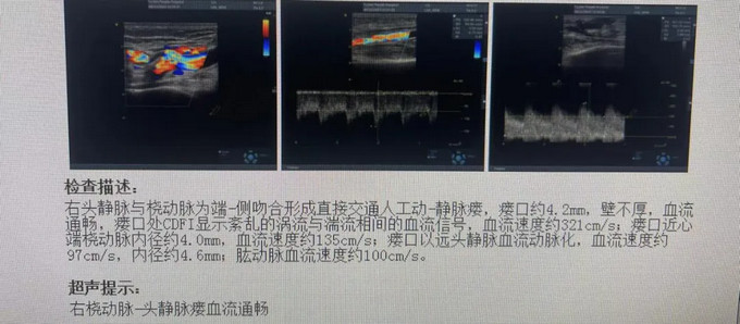 手術(shù)由腎病科張主任、李醫(yī)師完成,歷時(shí)1小時(shí),手術(shù)中張主任耐心置入導(dǎo)絲,并在導(dǎo)絲引導(dǎo)下置入擴(kuò)張球囊,經(jīng)過多次擴(kuò)張,確認(rèn)狹窄消失,血流通暢。術(shù)后超聲復(fù)查最窄血管內(nèi)徑擴(kuò)大至4.0毫米,內(nèi)瘺震顫明顯比術(shù)前強(qiáng)烈,而且手術(shù)次日便能夠穿刺內(nèi)瘺透析,血流量又達(dá)到了230ml/min,保障了血液透析的充分性。