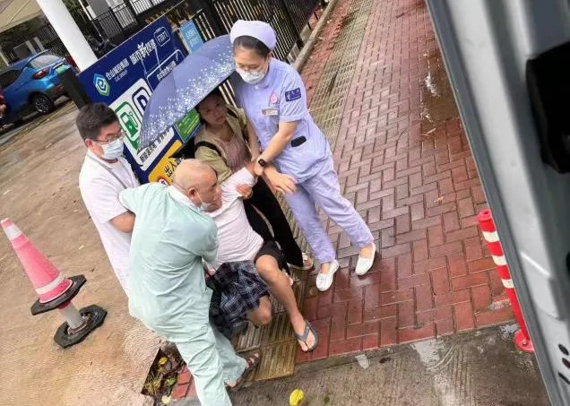 風(fēng)雨再大,也擋不住救治病人的心。7月25日上午,在風(fēng)雨中,一位年青男子在路邊突發(fā)無力,無法行走,接到120電話后,急診科醫(yī)護(hù)人員不顧大雨,迅速驅(qū)車來到現(xiàn)場,醫(yī)務(wù)人員將雨傘交到家屬手中,頂著風(fēng)雨,把病人安全護(hù)送到救護(hù)車,為了保持患者的體溫,護(hù)士還細(xì)心地為患者擦拭身上的雨水。