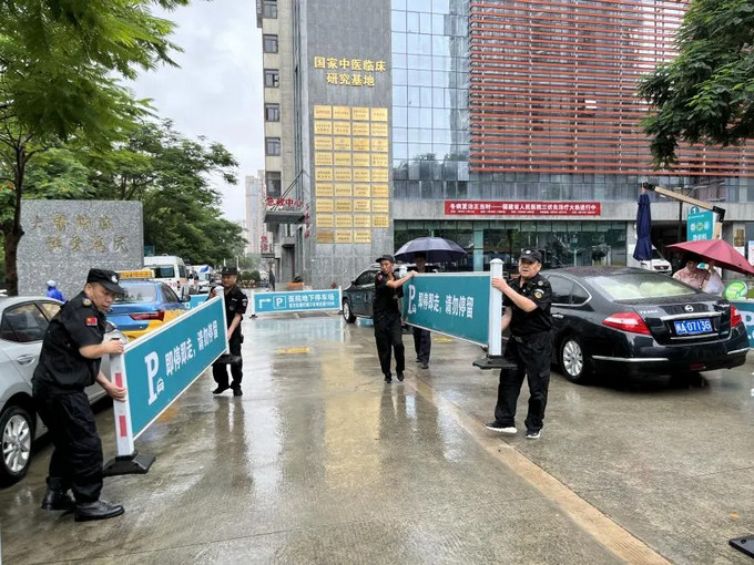 臺風(fēng)來臨前,保衛(wèi)處組織保安將即停即走車道上的隔離欄進(jìn)行加固和搬離,確保臺風(fēng)到來時(shí)不會被吹倒誤傷到行人和入院車輛。