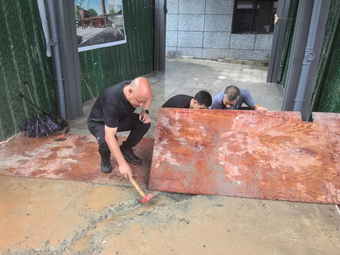 基建處的工作人員在臺風(fēng)來臨前固定施工現(xiàn)場圍擋,避免圍擋倒塌影響行人安全及出行。針對臺風(fēng)天帶來的雨水積水問題,基建處工作人員及時(shí)采取排澇措施以應(yīng)對工地積水問題。