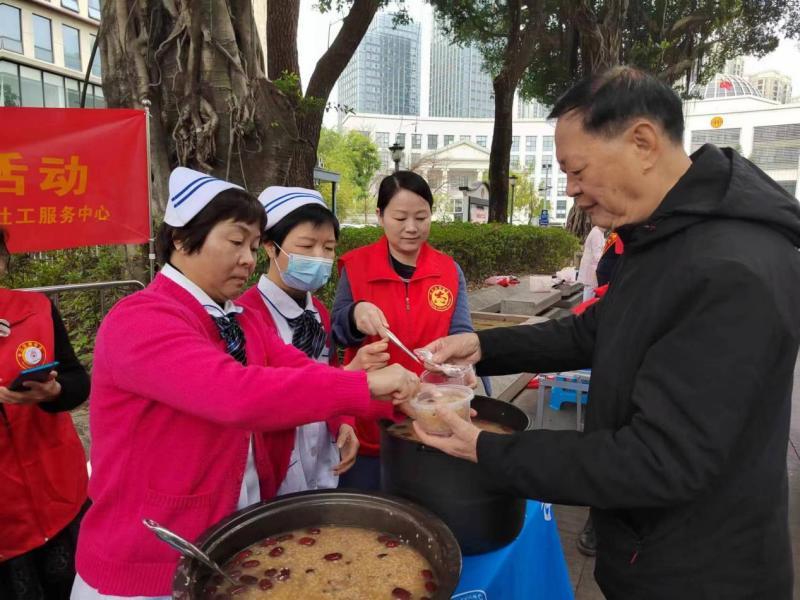 活動現(xiàn)場,醫(yī)護志愿者們?yōu)檫^往的老人們送上現(xiàn)場精心熬煮的“拗九粥”和節(jié)日祝福,讓他們感受到春日的濃濃暖意。