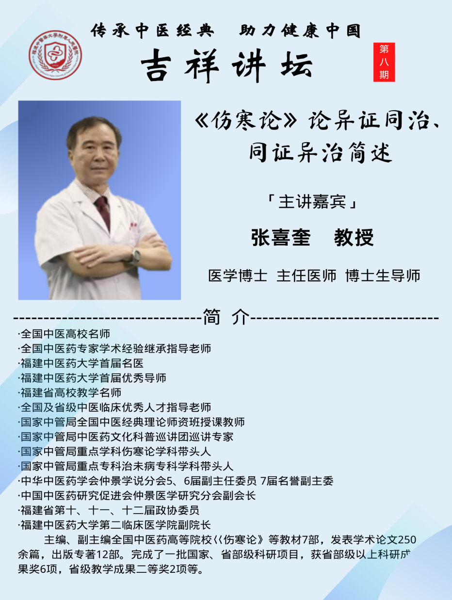 2022年6月27日下午,“吉祥講壇”第八期在我院1號(hào)樓附屬樓3層會(huì)議室開(kāi)講,全國(guó)中醫(yī)高校名師、國(guó)家中醫(yī)藥管理局重點(diǎn)學(xué)科傷寒論學(xué)科帶頭人張喜奎教授蒞臨講授《傷寒論》論異證同治、同證異治。全院醫(yī)護(hù)和師生員工在現(xiàn)場(chǎng)或通過(guò)線上參加。