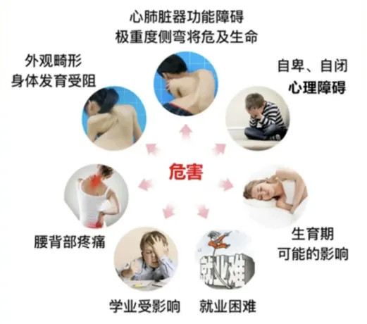 一、出現(xiàn)駝背、高低肩、長短腿、骨盆傾斜等,還有可能造成肩背部、腰部頑固性疼痛。