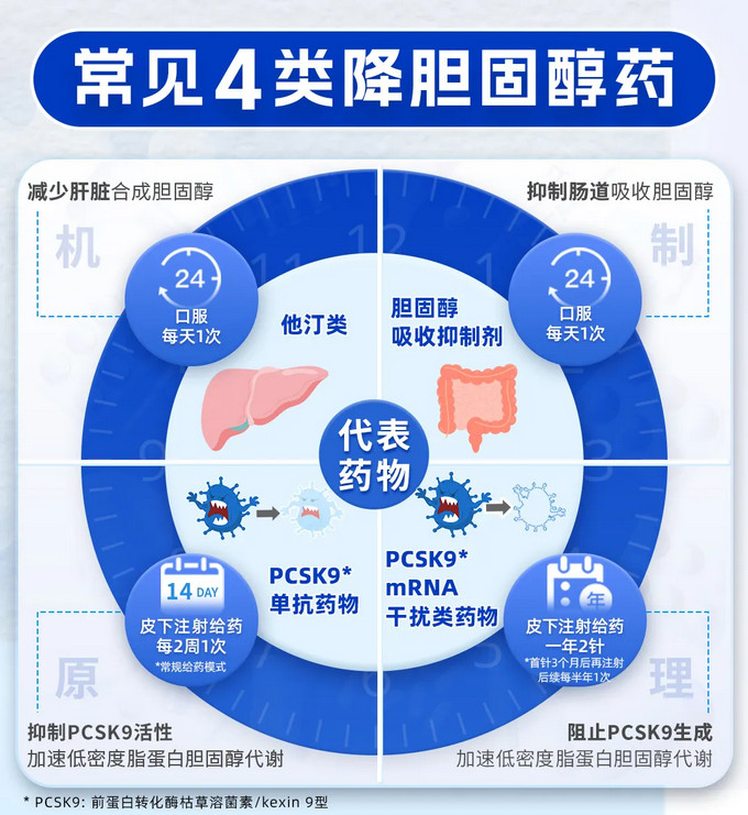 盡早開(kāi)始藥物治療血壓和血脂,常見(jiàn)降壓藥有利尿劑、β-體阻滯劑、CCB、ACEI、ARB、ARIN,常見(jiàn)降脂藥他汀類(lèi)、膽固醇吸收抑制劑、PCSK9 單抗藥物、PCSK9 mRNA干擾類(lèi)藥物,都要遵醫(yī)囑服用。