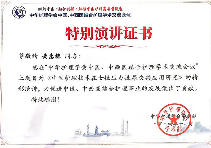 我院黃惠榕教授發(fā)表“中醫(yī)護(hù)理技術(shù)在女性壓力性尿失禁的應(yīng)用研究”主旨演講。她的分享賦能中醫(yī)、融合創(chuàng)新、助推中醫(yī)護(hù)理高質(zhì)量發(fā)展,拓寬與會(huì)者中醫(yī)護(hù)理技術(shù)創(chuàng)新應(yīng)用的新思路,值得借鑒與推廣。