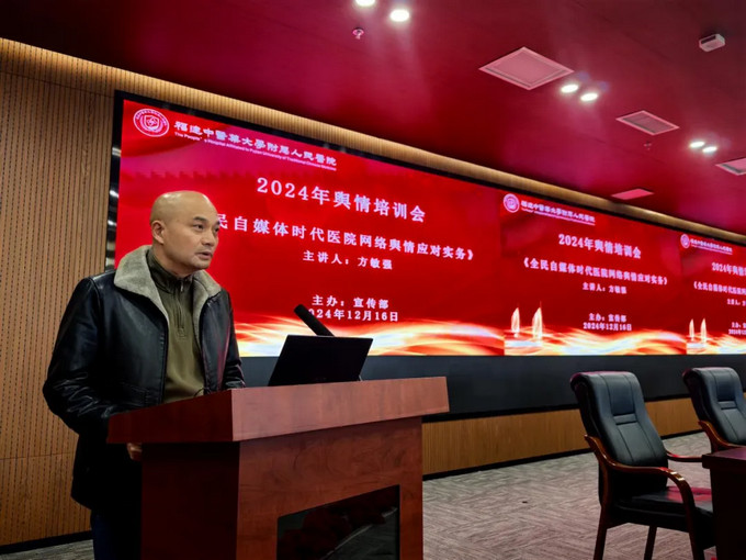 為學(xué)習(xí)宣傳貫徹黨的二十屆三中全會精神及習(xí)近平總書記在福建考察時的重要講話精神,進一步提升我院干部職工對互聯(lián)網(wǎng)發(fā)展規(guī)律的掌握能力,增強輿情敏感度,提升輿情應(yīng)對與處置能力,從而加強醫(yī)院意識形態(tài)領(lǐng)域陣地建設(shè)。12月16日下午,福建中醫(yī)藥大學(xué)附屬人民醫(yī)院開展網(wǎng)絡(luò)輿情與處置專題培訓(xùn),副院長陳武進主持會議,院領(lǐng)導(dǎo)、全體中層干部共計100余人參加。