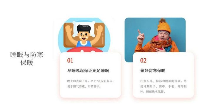 做好防寒保暖也關(guān)鍵,尤其是頭部、腳部和腰部。頭部陽(yáng)氣匯聚,受寒易致頭痛、頭暈;腳部為人體第二心臟,保暖可促進(jìn)血液循環(huán);腰部是腎之府,暖腰能護(hù)腎。外出可戴帽子、圍巾、手套,穿厚鞋襪,睡前用熱水泡腳并按摩涌泉穴,平時(shí)可穿護(hù)腰。