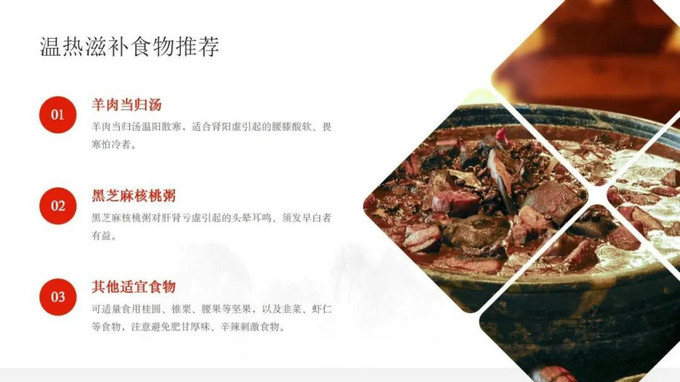 冬至飲食宜溫?zé)嶙萄a(bǔ)以養(yǎng)護(hù)陽(yáng)氣、補(bǔ)腎固精。羊肉當(dāng)歸湯是經(jīng)典之選,羊肉性溫能補(bǔ)體虛、祛寒冷,當(dāng)歸補(bǔ)血活血、調(diào)經(jīng)止痛,二者搭配可溫陽(yáng)散寒、補(bǔ)血益腎。具體做法為:羊肉500克切塊焯水,當(dāng)歸20克洗凈,與適量枸杞、生姜、紅棗一同放入砂鍋,加水燉煮約1.5小時(shí)至羊肉熟爛,加鹽調(diào)味即可。此湯適合腎陽(yáng)虛所致的腰膝酸軟、畏寒怕冷者。