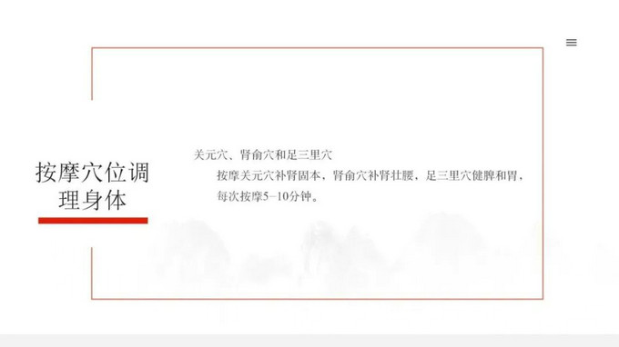 冬至可通過(guò)按摩穴位保健、調(diào)理身體。關(guān)元穴位于臍下三寸處,為小腸募穴,是人體元?dú)鈪R聚之地,按摩此穴能補(bǔ)腎固本、補(bǔ)益下焦。可用手掌心或掌根順時(shí)針?lè)较虬茨?,每?-10分鐘,每日2-3次,力度適中,有溫?zé)岣屑纯伞?