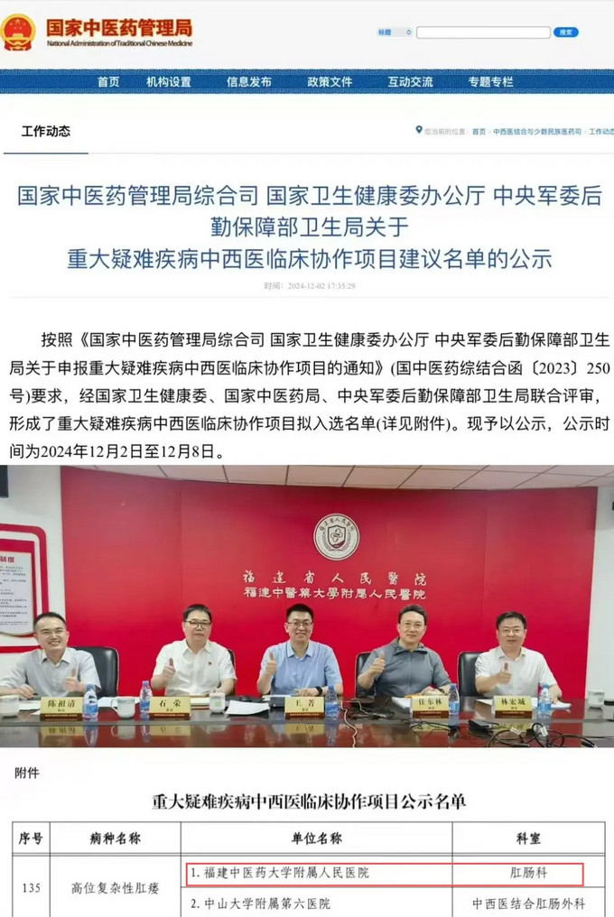 近日,國(guó)家中醫(yī)藥管理局綜合司、國(guó)家衛(wèi)生健康委辦公廳、中央軍委后勤保障部衛(wèi)生局聯(lián)合公布了重大疑難疾病中西醫(yī)臨床協(xié)作項(xiàng)目建議名單。福建中醫(yī)藥大學(xué)附屬人民醫(yī)院肛腸學(xué)科與中山大學(xué)附屬第六醫(yī)院中西醫(yī)結(jié)合肛腸外科聯(lián)合申報(bào)的“高位復(fù)雜性肛瘺”項(xiàng)目成功入選。這是對(duì)我院肛腸學(xué)科在診治肛腸重大疑難疾病方面綜合實(shí)力的高度認(rèn)可,也彰顯了我院在中西醫(yī)協(xié)同建設(shè)方面的卓越成效。