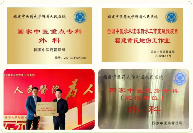 福建中醫(yī)藥大學(xué)附屬人民醫(yī)院(福建省人民醫(yī)院)瘡瘍蛇傷脈管外科創(chuàng)建于1958年,現(xiàn)為國(guó)家中醫(yī)優(yōu)勢(shì)專(zhuān)科、國(guó)家中醫(yī)藥管理局外科國(guó)家臨床重點(diǎn)專(zhuān)科、國(guó)家中醫(yī)藥管理局毒蛇咬傷重點(diǎn)專(zhuān)病、國(guó)家中醫(yī)藥管理局"福建黃氏蛇傷全國(guó)學(xué)術(shù)流派傳承工作室"建設(shè)項(xiàng)目、福建省蛇傷救治中心、福建省中醫(yī)藥學(xué)會(huì)外科分會(huì)主委單位、福建省中西醫(yī)結(jié)合學(xué)會(huì)燒傷病學(xué)分會(huì)主委單位。