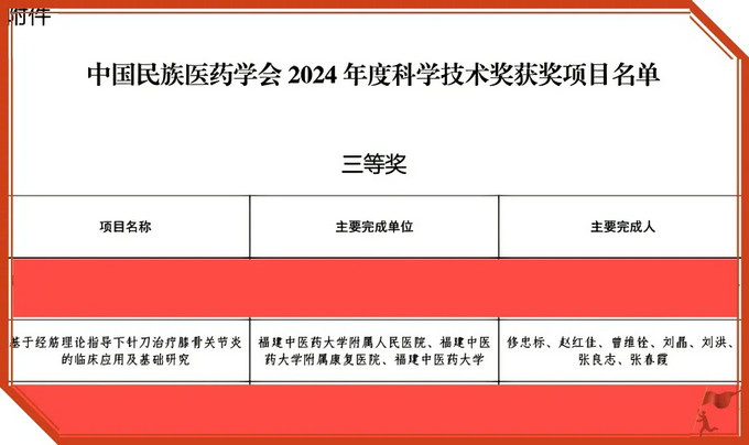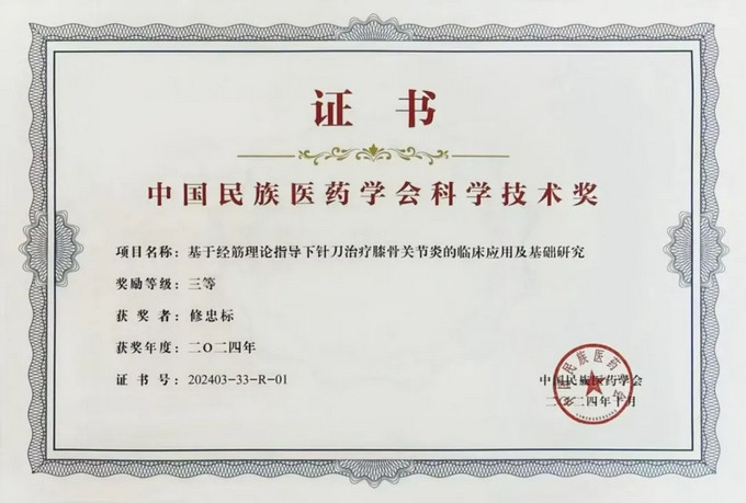 近日,福建中醫(yī)藥大學(xué)附屬人民醫(yī)院骨傷科修忠標(biāo)主任領(lǐng)銜的中醫(yī)骨傷學(xué)科團(tuán)隊(duì)與福建中醫(yī)藥大學(xué)附屬康復(fù)醫(yī)院、福建中醫(yī)藥大學(xué)合作完成的成果《基于經(jīng)筋理論指導(dǎo)下針刀治療膝骨關(guān)節(jié)炎的臨床應(yīng)用及基礎(chǔ)研究》在2024年度中國民族醫(yī)藥學(xué)會(huì)科學(xué)技術(shù)獎(jiǎng)評(píng)選中榮獲三等獎(jiǎng)。