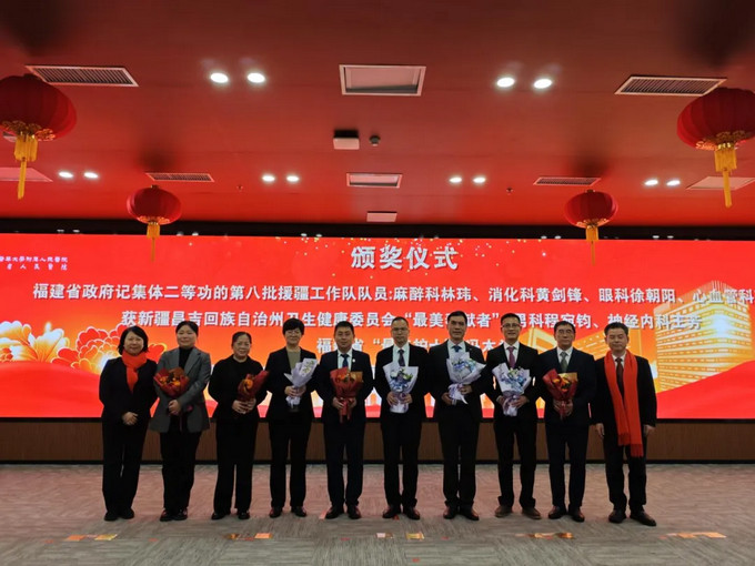 △福建省政府記集體二等功的第八批援疆工作隊(duì)隊(duì)員:麻醉科林瑋、消化科黃劍鋒、眼科徐朝陽(yáng)、心血管科石洪
