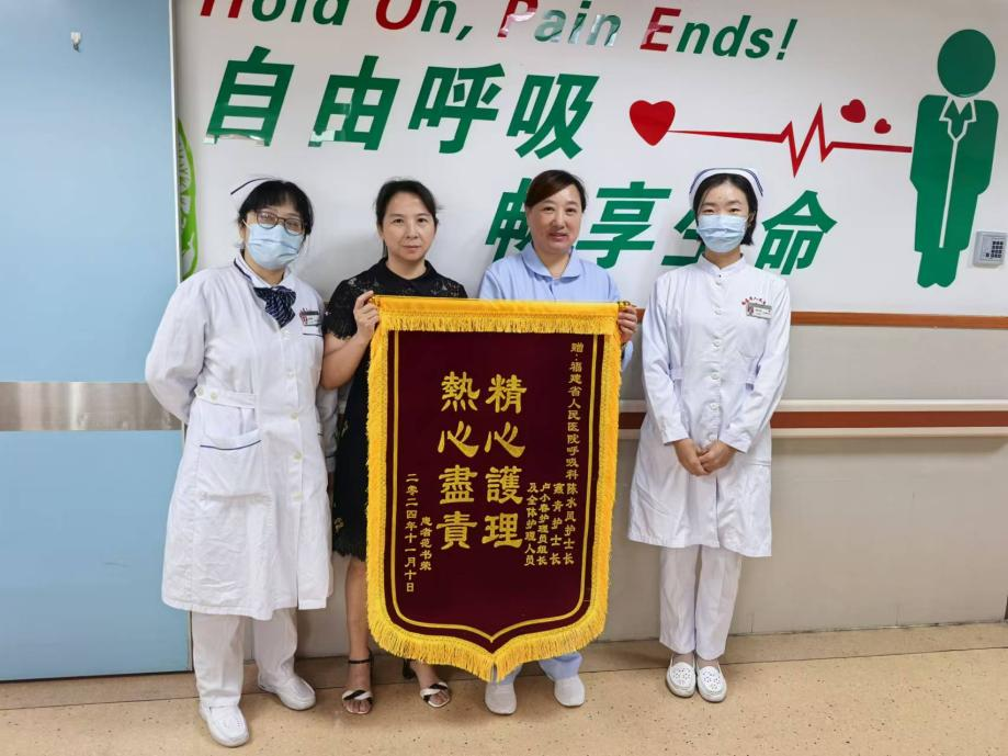 患者林阿姨入院第一天起就聘請了護理員照顧。出院當日患者子女帶著錦旗來到病房,向照顧林阿姨的護理員表達感激之情。因為自己在母親住院期間一直沒能陪在母親身邊照顧,感覺十分內疚,但是醫(yī)院的醫(yī)生、護士以及護理員們在住院期間都對患者給予了無微不至和專業(yè)精準的照顧、治療與護理,令做為子女的她感到十分放心。