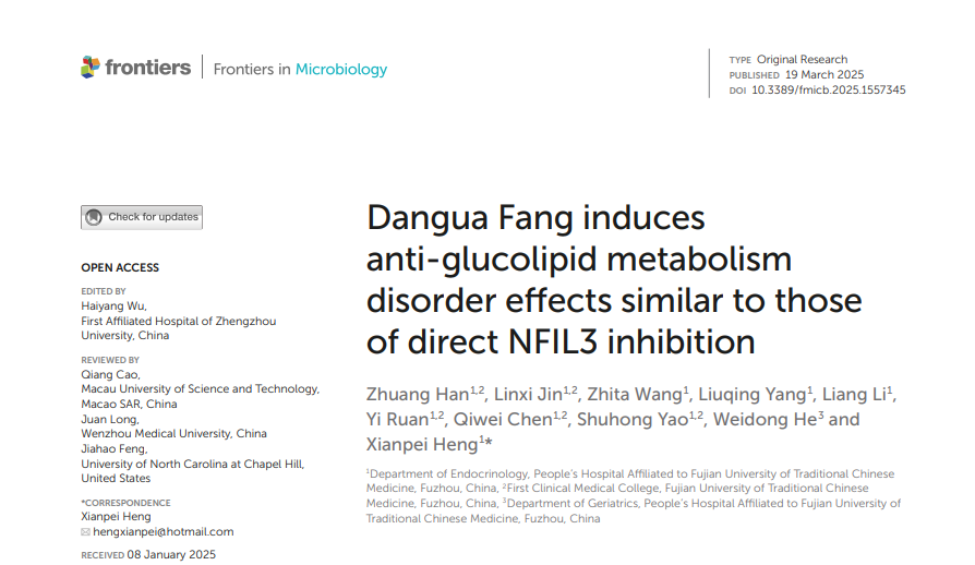 近日,我院國家中醫(yī)藥傳承創(chuàng)新中心重點病種糖尿病衡先培教授研究團隊(代謝內(nèi)分泌方向)在中科2區(qū)頂級期刊《Frontiers in Microbiology》上發(fā)表題為《Dangua Fang inducesanti-glucolipid metabolismdisorder effects similar to thoseof direct NFlL3 inhibition》的研究論文。
