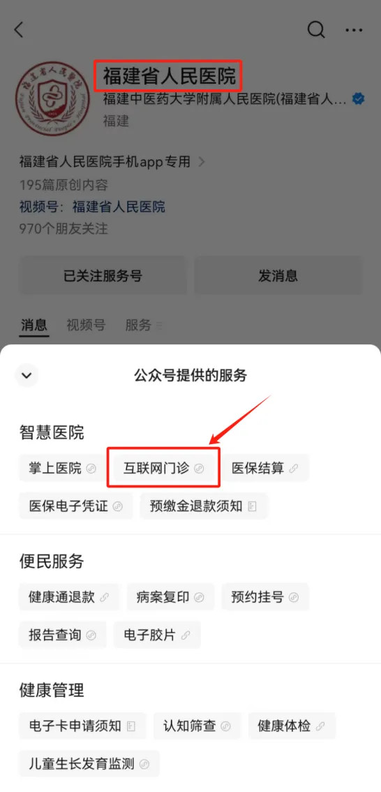 (1)關(guān)注“福建省人民醫(yī)院”微信公眾號,點擊“互聯(lián)網(wǎng)門診”