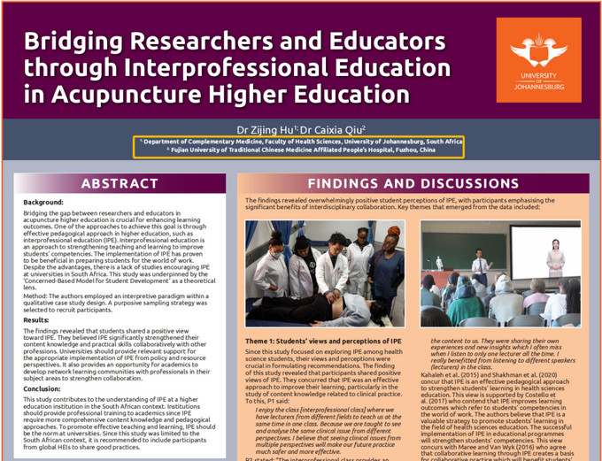 2025年4月4日-4月6日,在美國爾灣舉辦的國際針灸學(xué)術(shù)會議,約翰內(nèi)斯堡大學(xué)(南非)與福建中醫(yī)藥大學(xué)附屬人民醫(yī)院(中國)聯(lián)合開展的《中醫(yī)藥非洲本土化教育模式研究》課題、會議報告《Bridging researchers and educators through interprofessional education in acupuncture higher education》受到關(guān)注,并被《人民網(wǎng)》轉(zhuǎn)發(fā)。該研究聚焦中醫(yī)藥在非洲推廣中的教育創(chuàng)新路徑,系統(tǒng)總結(jié)了中南兩國在課程建設(shè)、臨床實踐等領(lǐng)域的合作經(jīng)驗,為傳統(tǒng)醫(yī)學(xué)國際化提供了可復(fù)制的實踐范本,促進(jìn)海外中醫(yī)藥高等教育發(fā)展。