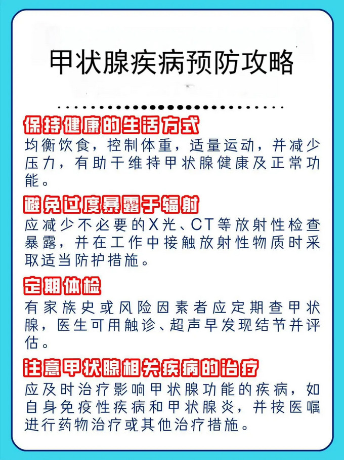 6.定期篩查:有甲狀腺疾病史如:甲狀腺結(jié)節(jié)、甲狀腺炎,有甲狀腺癌家族史、45歲以上的女性、兒童及青少年期接觸電離輻射、高碘飲食習(xí)慣人群。