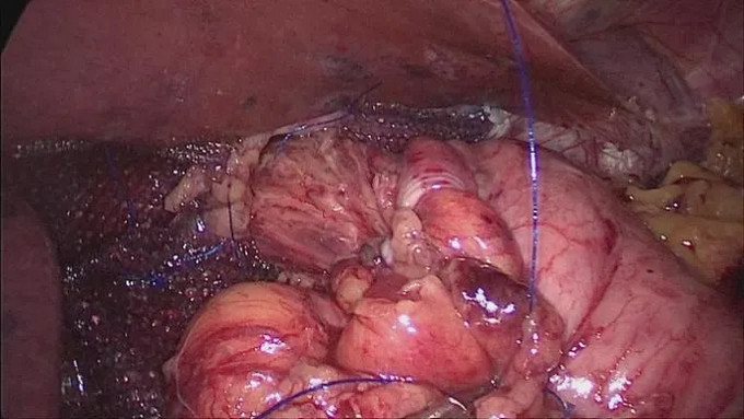 3.腹段食管腹腔化:用倒刺線縫合膈肌角,不可吸收縫線加固縫縮小食管裂孔;
