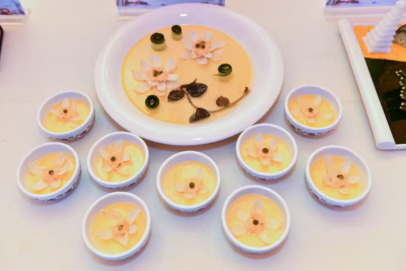第一道百蓮蝦:作品緊扣福建夏季“熱盛濕重”的特點,精選福建道地藥材“福九味”-金線蓮,與溫潤滋補的雞肉慢燉成湯。搭配百合、雞蛋、蝦茸精心制成的“蓮花”,靜浮湯面。此藥膳藥性平和,不溫不燥,共奏補腎健脾,清心安神之功效,是老少皆宜的專屬夏日輕滋養(yǎng)之品。