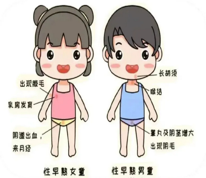 女孩在7.5歲前、男孩在9歲前出現(xiàn)第二性征發(fā)育。性早熟會導(dǎo)致成年終身高受損,還會對患兒生理和心理行為產(chǎn)生一系列影響。