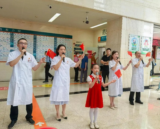 “沒有共產(chǎn)黨就沒有新中國……”“我愛你中國,心愛的母親……”“英雄的鮮血染紅了她……英雄的生命開鮮花”“五星紅旗迎風飄揚,勝利歌聲多么嘹亮”“我和我的祖國,一刻也不能分割”,激情昂揚的旋律,質(zhì)樸有力的歌詞,將就診空間轉(zhuǎn)化為愛國愛黨的情感磁場,吸引現(xiàn)場眾多患者和家屬駐足齊唱。