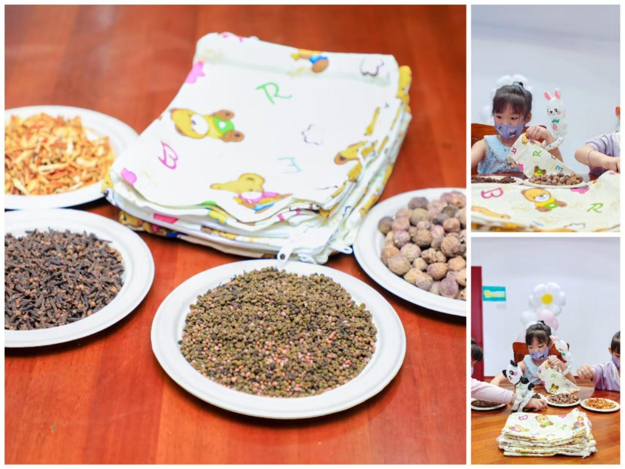 動手樂趣:家長和孩子一起動手,將藥材裝入特制的藥包中,共同完成一個充滿愛意的熱奄包。這不僅是一次手工體驗,更是一次珍貴的親子互動時光。
