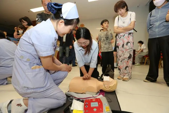 講解結束后,市民朋友們分組體驗,借助專業(yè)測試設備實時校正動作,急診醫(yī)護團隊也在一旁一對一指導,確保每個細節(jié)都規(guī)范。一位寶爸感慨:“終于敢下手了,關鍵時刻能救命!”