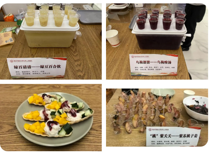 中醫(yī)茶飲藥膳品嘗區(qū)熱鬧非凡,醫(yī)院根據夏季節(jié)氣特點獨創(chuàng)的中藥藥膳茶飲“綠百清清——綠豆百合飲”“烏梅溜溜——烏梅酸湯”“桃紫夭夭——紫蘇桃子姜”“藍山晶晶——藍莓山藥泥”清香四溢,清熱解暑。