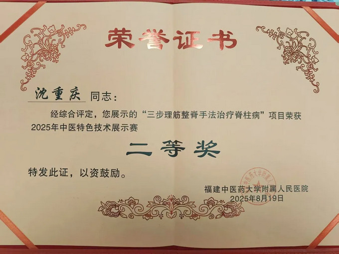 今年的醫(yī)師節(jié)中,在醫(yī)院中醫(yī)特色技術(shù)展示賽上,沈重慶憑借“三步理筋整脊手法治療脊柱病”項(xiàng)目斬獲競(jìng)賽二等獎(jiǎng),用實(shí)力印證了“年輕有為”這一標(biāo)簽?;颊邆冋勂鹚?,??滟澋溃骸八址?zhǔn)、心腸熱,每次找他治病,更像是找老朋友見見面、聊聊天?!?