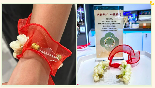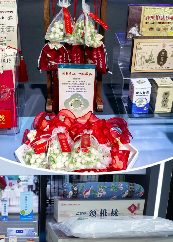 睡眠枕頭選用酸棗仁、夜交藤等中藥材填充,將傳統(tǒng)中醫(yī)藥的保健功能融入到日常助眠場景之中,是極具特色的中醫(yī)藥衍生產(chǎn)品。閩韻手環(huán)串聯(lián)茉莉鮮花與“福九味”石斛,這抹腕間風(fēng)雅,是福建風(fēng)物的匠心凝萃。取八閩沃土孕育的茉莉鮮花,綴以“福九味”道地石斛,每一顆珠串都浸潤著福建的生態(tài)靈韻與本草智慧;福建中醫(yī)藥大學(xué)附屬人民醫(yī)院logo牌內(nèi)嵌其中,是健康守護(hù)的閩地?fù)?dān)當(dāng);一經(jīng)展示,福建茉莉花特有的醇香飄滿福建展廳,深受國內(nèi)外友人喜愛。