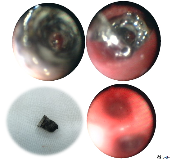 術(shù)中首先經(jīng)纖支鏡分離異物周圍黏連組織,腎上腺素局部止血,吸除周圍分泌物,充分暴露異物,采用異物鉗鉗取異物失敗,改為活檢鉗進入異物遠端管腔,打開活檢鉗,上提,退鏡,整個動作一氣呵成,順利取出圓柱型塑料異物(圖5.6.7.8)。術(shù)后復(fù)查患者管腔通暢,未見明顯出血,手術(shù)成功,避免了胸腔鏡下或開胸手術(shù),不僅成功為患者解除病痛,而且花費較少,一下子為患者節(jié)省了大筆外科手術(shù)費用,令患者及家屬萬分感激。