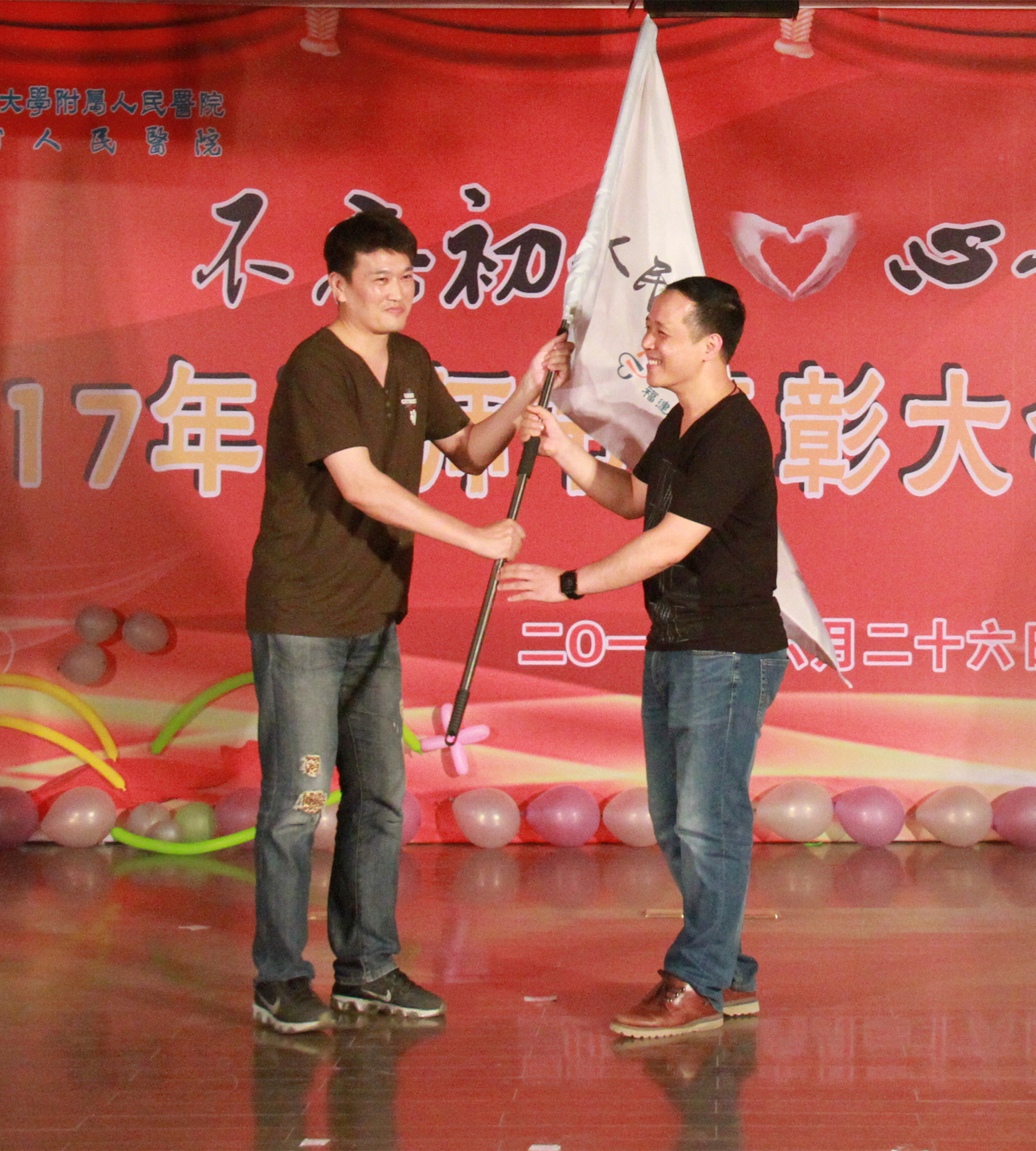 大會(huì)接著進(jìn)行了青年醫(yī)師協(xié)會(huì)換屆儀式,醫(yī)務(wù)部施婉玲主任介紹了青年醫(yī)師協(xié)會(huì)概況,對(duì)青年醫(yī)師協(xié)會(huì)自成立以來(lái)所做的工作給予了肯定,并高度贊揚(yáng)了新一屆青年醫(yī)師協(xié)會(huì)理事會(huì)組織策劃的青年優(yōu)秀論文評(píng)選、醫(yī)學(xué)知識(shí)競(jìng)賽,令本次醫(yī)師節(jié)系列活動(dòng)更加豐富多彩。最后,由上一屆會(huì)長(zhǎng)張富及新一屆執(zhí)行會(huì)長(zhǎng)陳陽(yáng)天進(jìn)行青年醫(yī)師協(xié)會(huì)會(huì)旗交接。