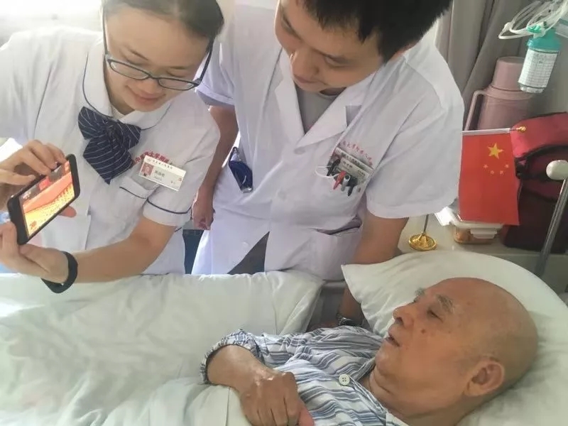 福建省人民醫(yī)院病房有一位臥床不起的老病號正在醫(yī)護人員協助下觀看閱兵儀式。