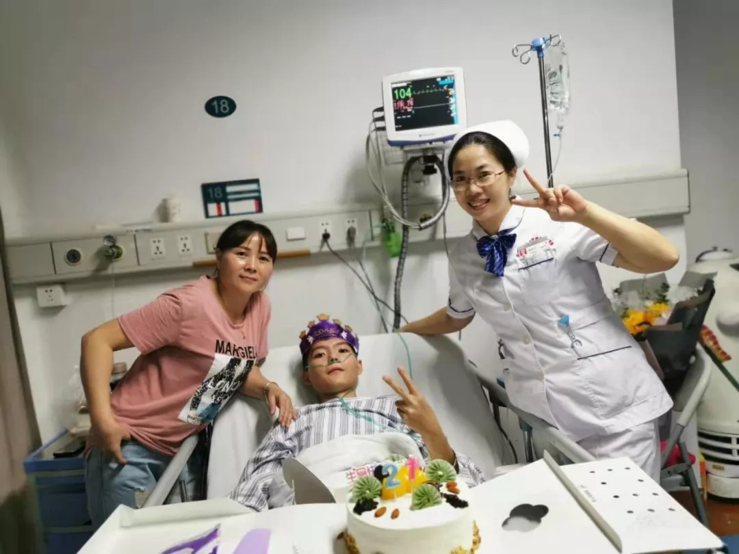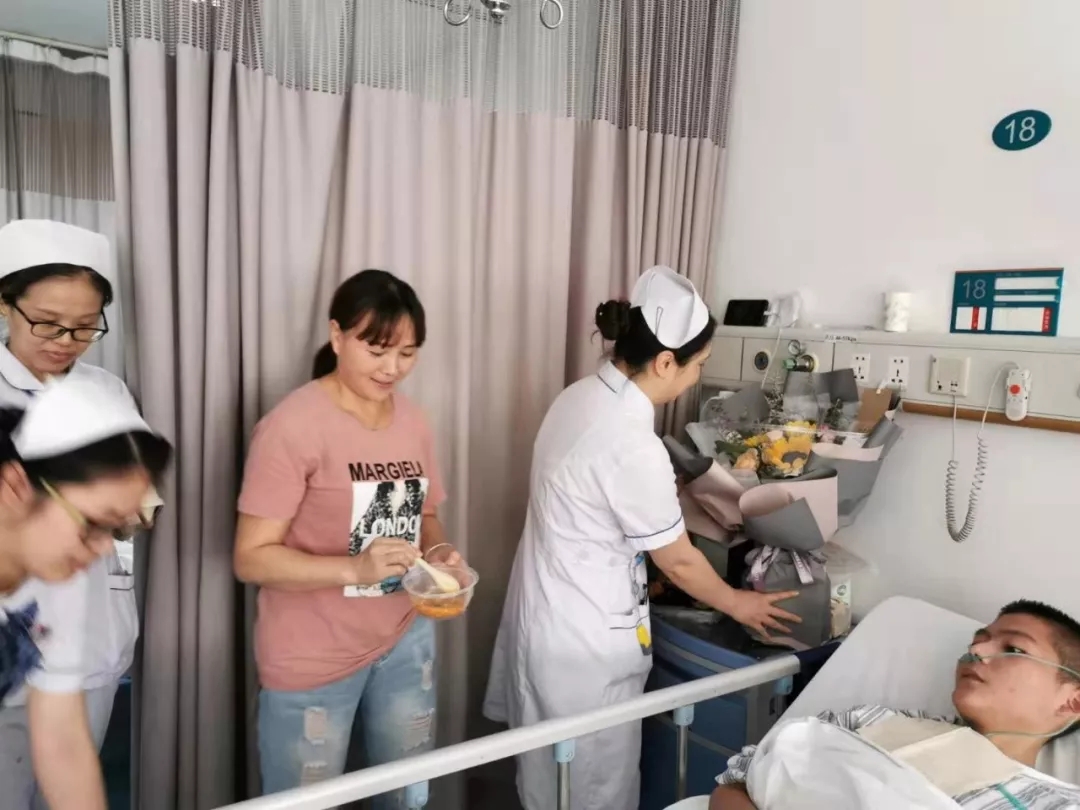 患者鐘某不幸因車禍住院兩個多月,護士在與他聊天過程中,得知鐘某10月1日生日,為鼓勵他積極面對生活,戰(zhàn)勝病魔,科室護士們?yōu)樗e辦了一場特別的病房生日會,定制了一個蛋糕和一束鮮花,手繪了精美的小卡片。10月1日,護士們在病房和鐘某觀看閱兵儀式,同祖國一起慶生!