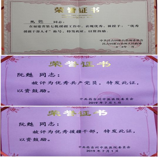 因援疆工作表現(xiàn)優(yōu)秀,阮甦同志被昌吉回族自治州授予“優(yōu)秀援疆干部人才”稱號,并被昌吉州中醫(yī)醫(yī)院評為優(yōu)秀共產(chǎn)黨員和優(yōu)秀援疆干部。