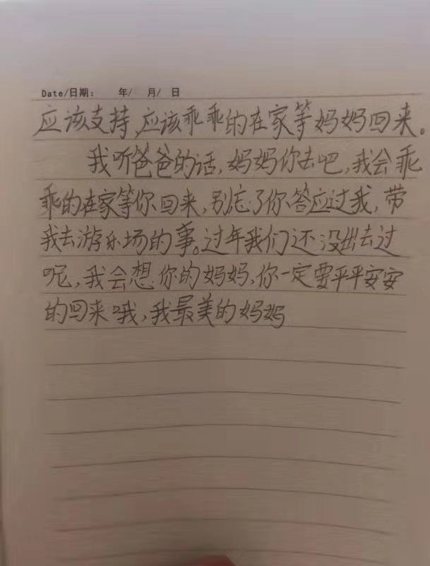 “我會(huì)想你的媽媽,你一定要平平安安回來(lái),我最美的媽媽!”這是侯楊清的大女兒在聽(tīng)說(shuō)媽媽要出征前線時(shí),寫(xiě)下的話。作為重癥醫(yī)學(xué)科第一名骨干護(hù)士,侯楊青主動(dòng)請(qǐng)戰(zhàn)前線,剛開(kāi)始家人并不理解,家里兩個(gè)孩子還小,還需要母親的照顧,她去武漢了,所有家庭的重?fù)?dān)都落在丈夫和父母身上。她耐心地和家人解釋,她說(shuō):“這是作為一名護(hù)士的責(zé)任和義務(wù),我是ICU護(hù)士,我專業(yè)對(duì)口,疫區(qū)很需要我這樣的,希望你們理解我,支持我”。她的意愿最終獲得了家人的認(rèn)可。當(dāng)年在畢業(yè)典禮上的南丁格爾誓言還聲聲在耳,“終身純潔,忠貞職守”,這就是護(hù)理人的責(zé)任和擔(dān)當(dāng)。