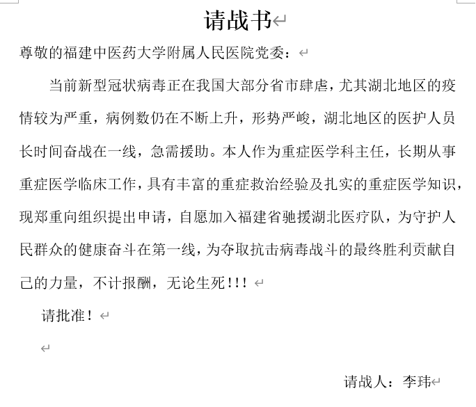 我志愿加入支援湖北醫(yī)療隊(duì),牢記習(xí)近平總書(shū)記重要指示,不負(fù)黨和人民的重托,弘揚(yáng)大醫(yī)精誠(chéng)的精神,踐行人民醫(yī)院為人民的宗旨,聽(tīng)從指揮,勇于擔(dān)當(dāng),眾志成城,攻堅(jiān)克難,不懼艱險(xiǎn),不辱使命,堅(jiān)決打贏新冠肺炎疫情防控阻擊戰(zhàn)!