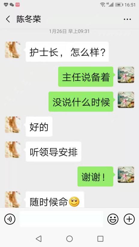 護(hù)理骨干何艷華,作為醫(yī)院青年人才,在知道醫(yī)院招募志愿者的第一時(shí)間,本著人民醫(yī)院為人民的服務(wù)理念,主動(dòng)請(qǐng)戰(zhàn)疫情一線。作為這次成為馳援湖北的志愿者,她這樣說(shuō):“我家是醫(yī)學(xué)世家,家族眾多醫(yī)務(wù)工作者,我只是其中平凡的一員,這次入選馳援武漢第二批志愿者,家里就通知了我哥,我告訴他:我和你們一樣,都是為了抗擊新型冠狀病毒肺炎在戰(zhàn)斗,只是地理位置不同而已。同樣作為醫(yī)務(wù)人員的他很支持我,有他這個(gè)大后方支持,我可以心無(wú)旁騖地上前線戰(zhàn)斗!”