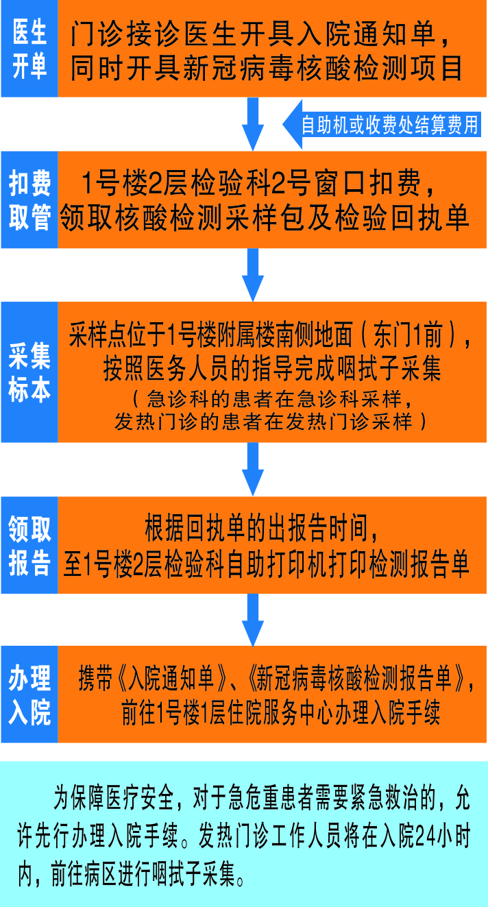 目前全國新冠肺炎疫情防控已進入常態(tài)化防控階段,為了最大限度降低院內(nèi)交叉感染發(fā)生風(fēng)險,確保您和他人在院期間安全接受診療,根據(jù)國家、省疫情常態(tài)化防控總體部署要求,我院自2020年5月11日起將新冠病毒核酸檢測納入入院篩查項目。除病情急危重需要緊急救治的患者外,所有患者在入院前必須進行新冠病毒核酸檢測,待檢測報告出具且結(jié)果為陰性后,方可辦理入院手續(xù)?,F(xiàn)將有關(guān)事項告知如下: