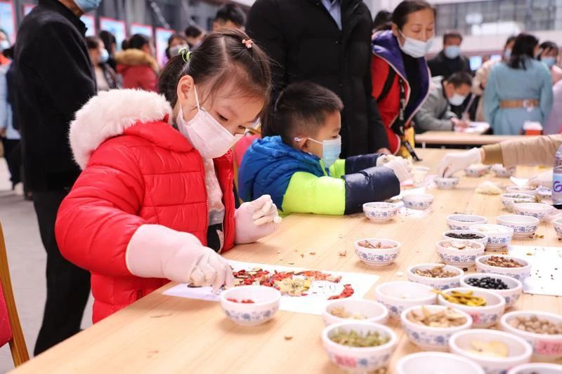 中藥貼畫區(qū)是最受孩子喜歡的區(qū)域。幾十種生活中常見的中藥材一字排開,孩子們一邊在家長的指導(dǎo)下貼畫,一邊饒有興致地詢問藥材的名字功效。