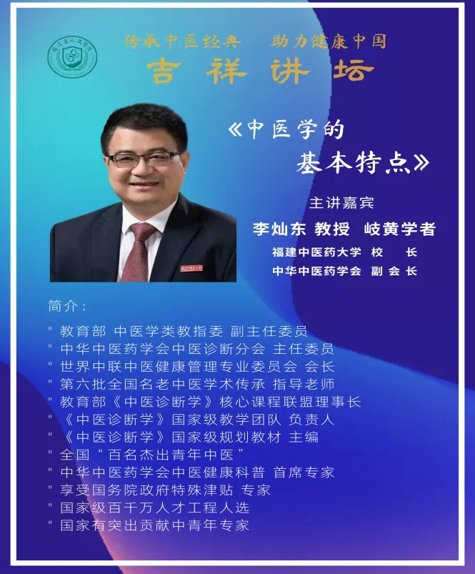 2021年8月5日下午,“吉祥講壇”第一期在我院1號樓附屬樓3層會議室開講,福建中醫(yī)藥大學(xué)校長李燦東教授蒞臨講授《中醫(yī)學(xué)的基本特點》。