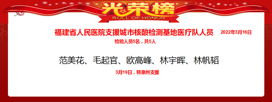 3月16日,福建省人民醫(yī)院派出檢驗人員范美花、毛起官、歐高峰、林宇暉、林帆韜支援福州市城市核酸檢測基地。