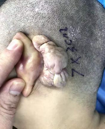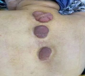 患者陳某,60歲,胸部瘢痕疙瘩增生35年,時(shí)常自覺瘙癢,衣物摩擦可有觸痛不適,曾自己嘗試通過網(wǎng)絡(luò)途徑購(gòu)買多種價(jià)格高昂“祛疤藥物”治療,疤痕不僅沒有得到緩解,反而進(jìn)行性增生加重。遂就診多家醫(yī)療機(jī)構(gòu)先后進(jìn)行注射、切除等多種診療,但瘢痕疙瘩反而增生較前更大。后經(jīng)人介紹來到福建省人民醫(yī)院皮膚科,經(jīng)詳細(xì)檢查后,王斗訓(xùn)副主任醫(yī)師團(tuán)隊(duì)最終制定了中西醫(yī)結(jié)合的診療方案:先行手術(shù)切除瘢痕疙瘩組織,創(chuàng)面拆線后行淺層放療SRT-100,后期配合內(nèi)服桃仁、藏紅花、浙貝母、昆布等活血化瘀、軟堅(jiān)散結(jié)方劑,外用專科制劑“積雪草油”按摩、穴位封閉、協(xié)定方中藥熏蒸、火針等,內(nèi)外聯(lián)合,標(biāo)本兼顧。治療1年后復(fù)查,瘢痕未再增生,患者對(duì)療效非常滿意。