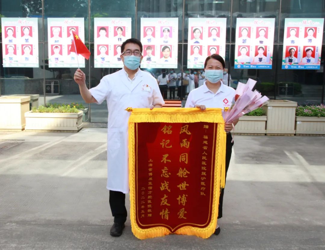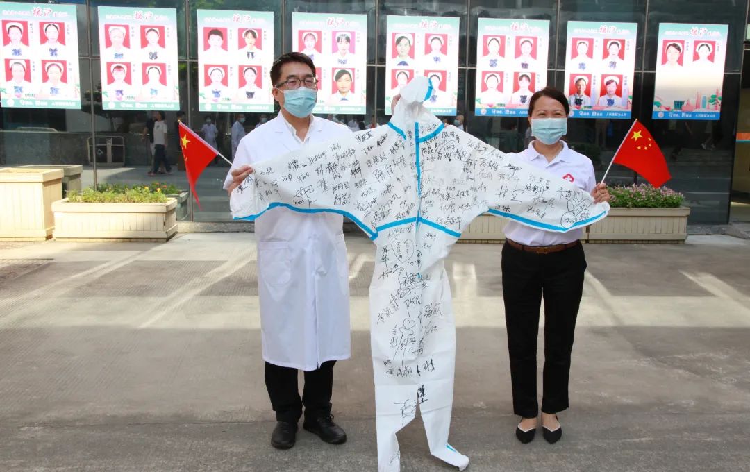 醫(yī)院援滬醫(yī)療隊(duì)領(lǐng)隊(duì)、黨委書(shū)記趙紅佳,向陳捷院長(zhǎng)贈(zèng)送上海方艙醫(yī)院錦旗和全體隊(duì)員簽名的防護(hù)服