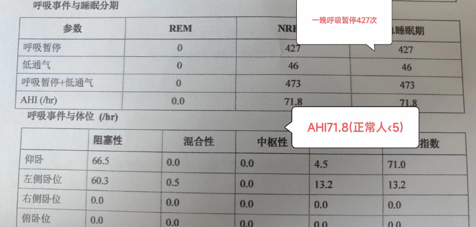王女士(化名)身高156.5cm,體重90kg,BMI(體重指數(shù))36.7kg/㎡(BMI正常范圍是18.5~23.9),腰圍116cm,臀圍121cm,一晚上睡眠395分鐘中,呼吸暫停了427次,單次最長憋氣時間74秒,AHI指數(shù)(呼吸暫停、低通氣指數(shù))高達71.8。