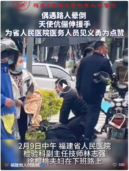 林志強(qiáng)、徐櫻桃夫妻倆其實(shí)是做了好事不留名,路人偶然拍攝到這段救人的畫面發(fā)到了視頻傳播平臺,醫(yī)院同事無意間看到,轉(zhuǎn)發(fā)到科室群,大家才知道。