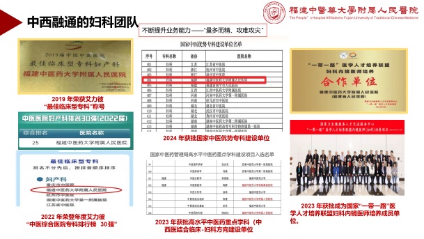 福建中醫(yī)藥大學(xué)附屬人民醫(yī)院婦科是首批衛(wèi)生部批準(zhǔn)的婦科內(nèi)鏡診療技術(shù)培訓(xùn)基地及四級(jí)婦科內(nèi)鏡手術(shù)培訓(xùn)基地,全球首家“國際婦科內(nèi)鏡考評(píng)與標(biāo)準(zhǔn)學(xué)院”,國家首批“一帶一路”醫(yī)學(xué)人才培養(yǎng)聯(lián)盟婦科內(nèi)鏡醫(yī)師培養(yǎng)項(xiàng)目成員單位。為國家中醫(yī)優(yōu)勢專科,國家高水平中醫(yī)藥重點(diǎn)學(xué)科,福建省婦科微創(chuàng)與整合盆底臨床研究中心,福建省重點(diǎn)專科,福建中西醫(yī)結(jié)合研究院微創(chuàng)醫(yī)學(xué)研究所,福建中醫(yī)藥大學(xué)碩士、博士授權(quán)點(diǎn)。為中國醫(yī)師協(xié)會(huì)整合醫(yī)學(xué)分會(huì)整合盆底醫(yī)學(xué)專委會(huì)主委單位,福建省中醫(yī)藥學(xué)會(huì)中醫(yī)婦科分會(huì)主委單位,福建省中西醫(yī)結(jié)合學(xué)會(huì)微創(chuàng)學(xué)分會(huì)、整合盆底醫(yī)學(xué)分會(huì)主委單位,福建省海峽醫(yī)藥衛(wèi)生交流協(xié)會(huì)婦科微創(chuàng)與盆底專業(yè)委員會(huì)主委單位,2018年獲艾力比最佳婦產(chǎn)??品Q號(hào),2022年中醫(yī)綜合醫(yī)院??婆判邪瘛保瑯s登??婆琶?5強(qiáng)。多次獲省標(biāo)兵崗、巾幗標(biāo)兵、三八紅旗集體等稱號(hào)。
