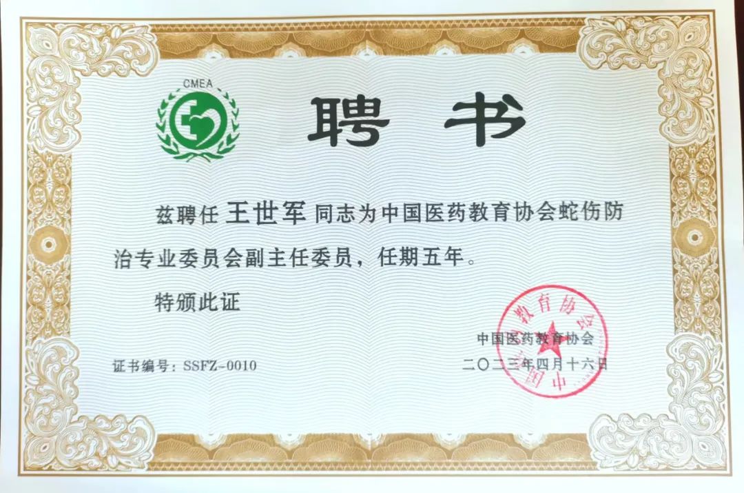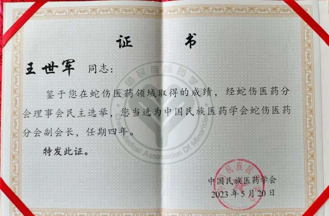 祝賀!我院王世軍副主任醫(yī)師當(dāng)選中國民族醫(yī)藥學(xué)會蛇傷醫(yī)藥分會副會長